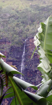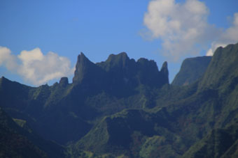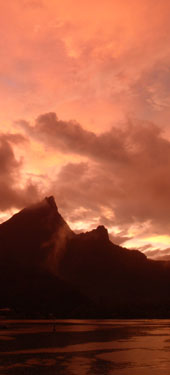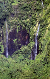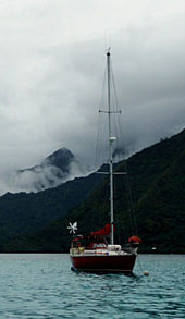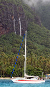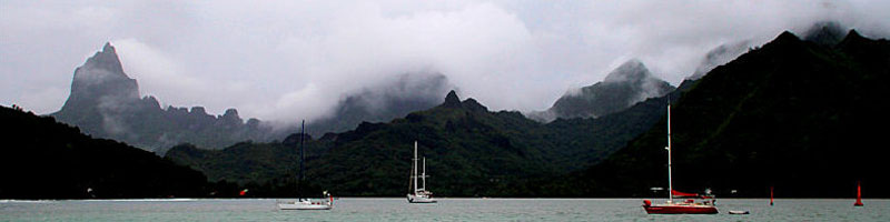 Début janvier, à la faveur d'un début de dépression, tandis que nous étions sur Bora Bora, nous avons bénéficié d'une navigation au portant, avec des vents de Nord-Ouest, pour revenir sur Moorea. Cette navigation se fait en général nez au vent. Cette saison n'a pas que des désavantages. Répit de courte durée, car la dépression a réellement éclaté le lendemain de notre arrivée à Opunohu. Elle s'est surtout acharnée sur les îles sous le vent, que nous venions de quitter, présageant à juste titre qu'elles étaient en première ligne de ce genre de phénomène. Nous amis restés à Raiatea y ont subi des vents de 40 nœuds et plus tandis que nous essuyions des grains, et des vents moins réguliers. Pendant cinq jours, il nous a été impossible de quitter le bateau, en raison de ce régime et de pluies diluviennes. Tant et si bien que les falaises tout autour du mouillage se sont parées de dizaines de cascades, spectacle rare, aux dires des habitants.