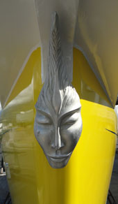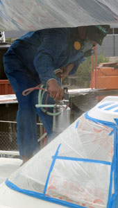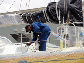 Pendant que Tamatai travaille à l'intérieur, Arsène et son équipe préparent l'extérieur : habillage pour refaire le jaune de la coque, déshabillage et … rhabillage pour refaire le pont et l'antidérapant. En une phrase, je viens de vous résumer trois semaines de travail qui n'a pas été facilité par la météo. Nous avons eu dix jours de pluie diluvienne. Et, malgré ce handicap, Arsène est parvenu à travailler, sans pour autant mettre en péril la délicate phase d'accrochage. Un miracle !
