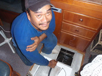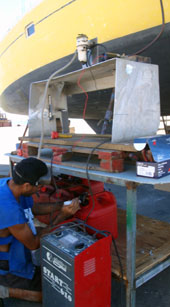 Pendant le chantier, Alain vient vérifier le travail de Tamatai, il pousse la minutie jusqu'à lui faire nettoyer les soudures à la brosse à dents (c'est ce que je fais pour le reste du bateau). En réalité, Alain et Tita travaillent, en parfaite complémentarité, sur chaque bateau, comme si c'était le leur. Petits ou grands, tous ont droit aux mêmes attentions, et ils poussent le perfectionnisme s'impliquant à tous les niveaux.