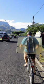 Si les équipes de Technimarine sont sur la brèche, de notre côté nous ne sommes pas « que » spectateurs. Je vous épargne une liste fastidieuse à énoncer de « petits » travaux qui ont néanmoins leur importance ! Heureusement que nous avions nos vélos pour effectuer les courses d'accastillage. Et puis, un grand moment fut celui où nous faufilons dans la circulation de Papeete pour aller chercher les nouveaux plexis de notre timonerie. Il faut voir Dom à l'oeuvre ! Il ressemble à ces vitriers du début du 20e siècle !